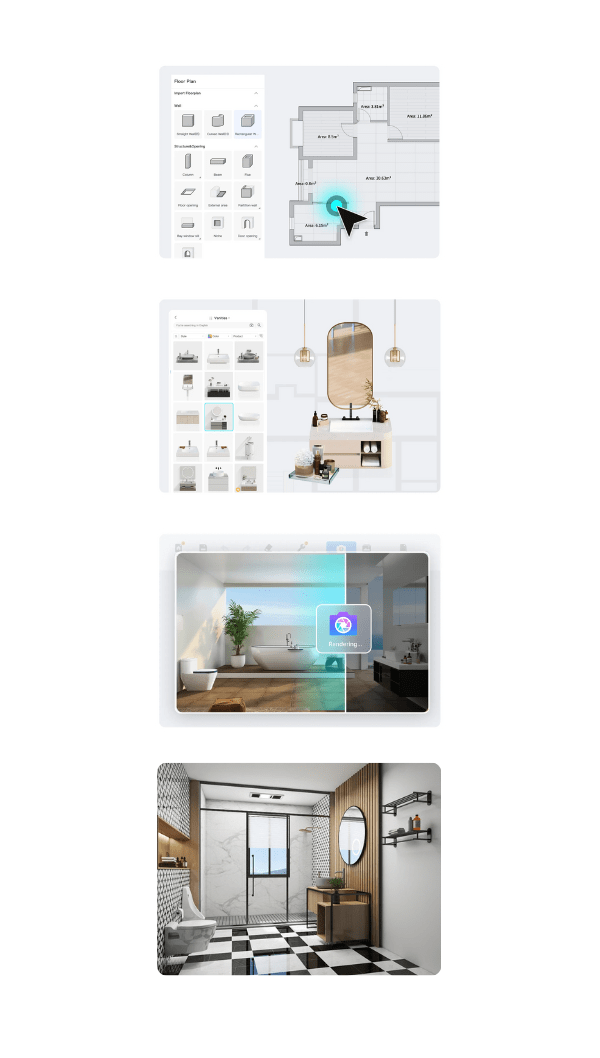Łazienka to jedno z najdroższych i najtrudniejszych pomieszczeń do zaplanowania. Podobnie jak w kuchni, każdy błąd kosztuje – a do tego nie zawsze da się go naprawić. Projektowanie łazienki 3D w Coohom pozwala podjąć decyzje „na sucho”. Zobaczysz układ, materiały, oświetlenie i efekt końcowy, zanim kupisz choć jedną płytkę. To prosty, wizualny sposób na dopasowanie łazienki do Twojego stylu życia i rozmiaru pomieszczenia.
